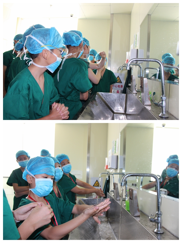 参观的最后一站是手术室,也是医院最神秘的地方。光是穿手术衣、戴帽子口罩就花去了近二十分钟。“里面的衣服不能露出来,头发要塞到帽子里面,口罩要遮住鼻子……”原来进手术室这么讲究。